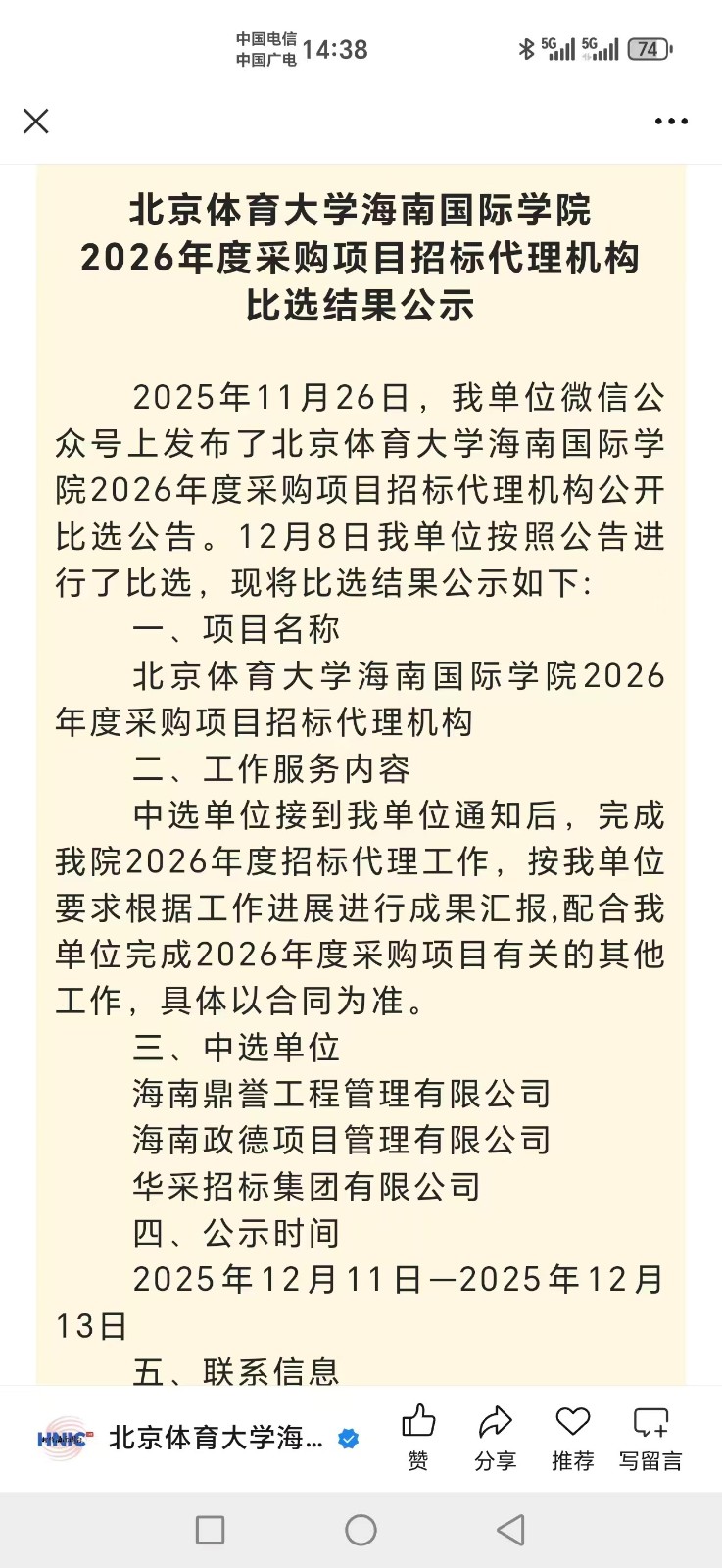 发布日期:2025-12-22 来源:九州·体育(中国)官方网站-JIUZHOU SPORTS近日,九州·体育(中国)官方网站-JIUZHOU SPORTS 凭借专业实力与规范服务,先后成功入围北京师范大学、中央戏剧学院、北京体育大学海南国际学院、琼台师范学院等四家高校,以及北京市西城区展览路街道、海南省第三人民医院、海南省老年病医院三家政企医疗单位的招标代理机构库,实现多领域业务拓展新突破。